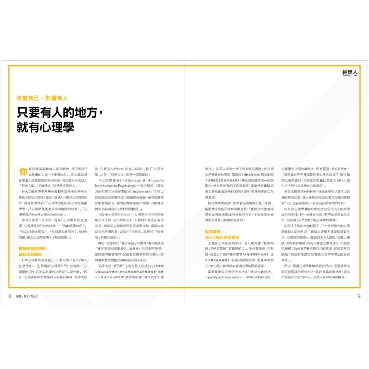 其實,我們在生活和職場中,每天都在展開A.T.力場。父母與孩子的爭吵,是彼此不懂彼此;老闆找員工談話,員工往往戒慎恐懼,不願透露真正在想什麼;消費者面對銷售人員,雙方也是百般攻防、說話左閃右躲,不輕易讓對方知道底線。從親子到同事,從臥房到辦公室,我們習慣隱藏真實想法,害怕一旦暴露會被加以利用。 然而,生活總得過下去,工作總要繼續進行,還是要找到有效的方式了解對方想法,不能一味靠猜忌來達到目的。心理學就是一門可靠的工具,透過理性科學方法、縝密的實驗驗證,統計歸納出大多數人心理運作的機制。當然,個體存在差異,心理學雖然不能100%命中所有人的心思,卻也提供有憑有據的思考邏輯,理解大家可能的想法。