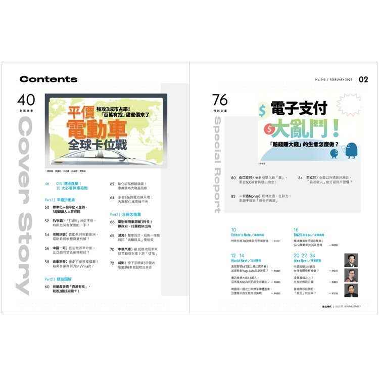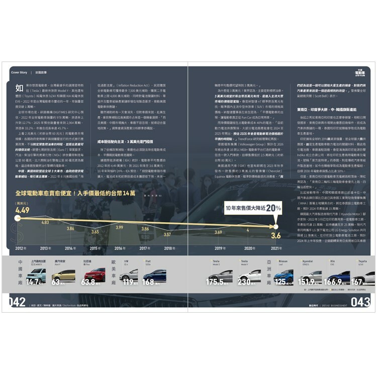 因此,汽車業的戰場,已從燃油車和電動車之爭,轉為電動車和電動車之爭,產量和成本是決勝關鍵。從晶片到電池,再到車內大大小小的各種零件和軟體,每一環節業者都在奮戰。採訪編輯陳映璇蒐集大量資料和採訪多家國內外業者,找到分析這場戰爭的新角度。