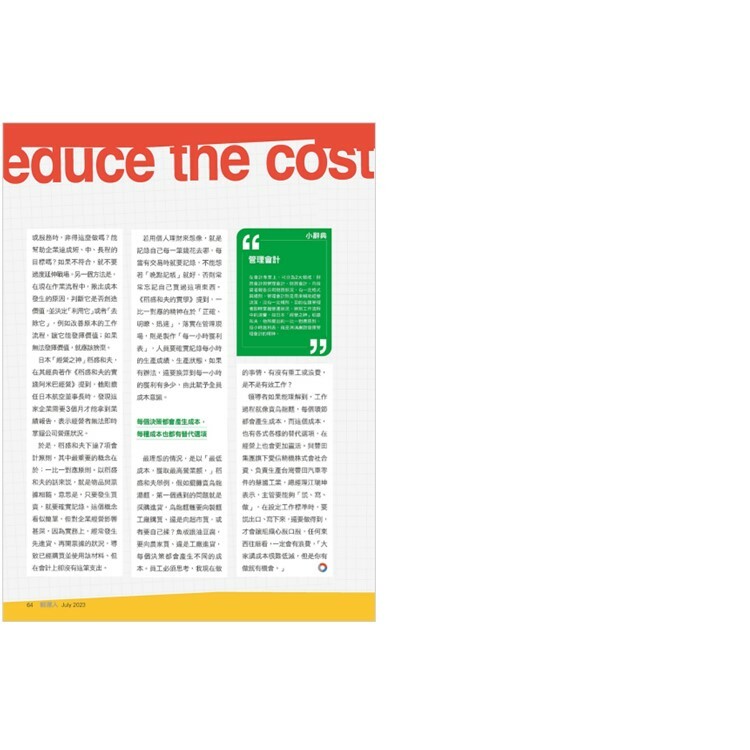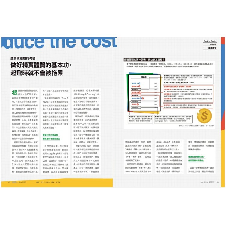 隨著通貨膨脹、景氣成長放緩,企業不得不面對整體營運成本上升的問題,想要控制成本,該從哪裡下手?如何減脂肪,卻不傷到企業的筋骨?本次專題,在企業經營各面向,提出相應觀察指標,帶領讀者正確認識成本、計算成本,以及辨識應該消除的浪費,做好扎實的成本訓練,讓你花出去的每筆錢,都有價值。