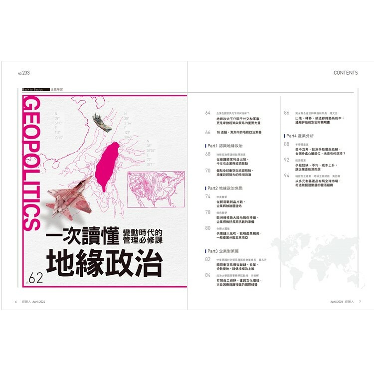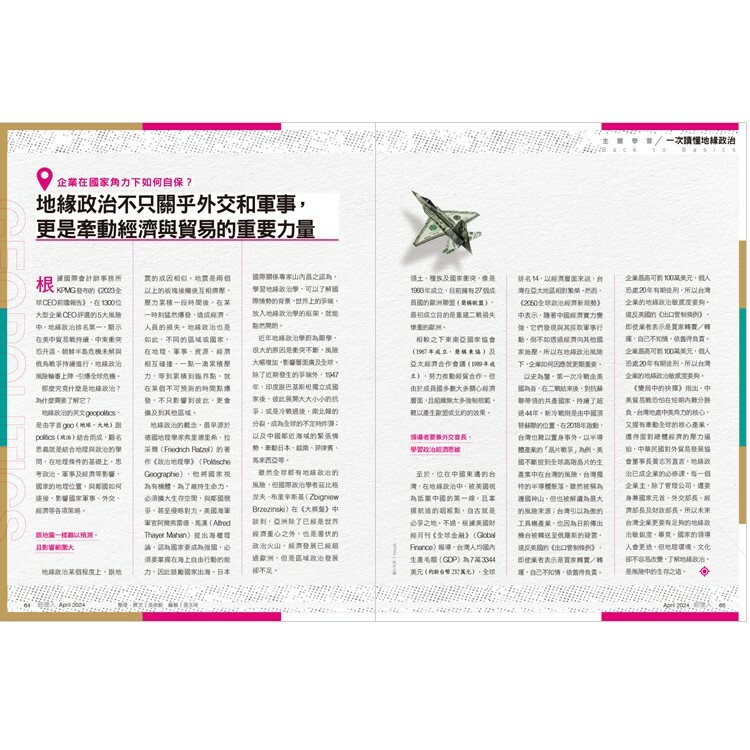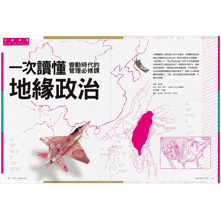 台積電創辦人張忠謀在2019年曾說,台積電將成為地緣政治策略家的必爭之地,當時中美對抗火苗剛起。《經濟學人》(The Economist)2021年封面專題稱台灣為世界上最危險的地方,時間來到2024年,地緣政治愈演愈烈,CNN說台灣沒有最危險,只有更危險。在全球經貿網絡緊密交織的情況下,經理人必須掌握國際局勢變化,了解、評估地緣政治帶來的衝擊,方能及早因應。