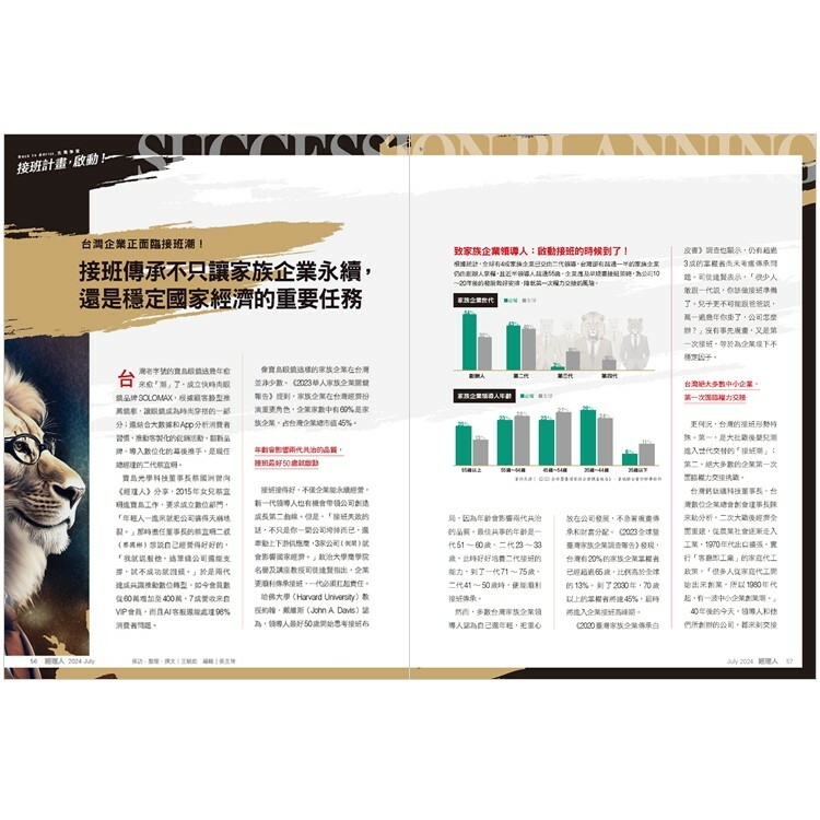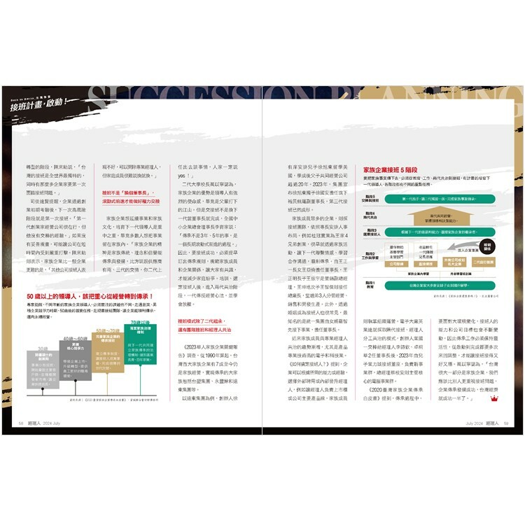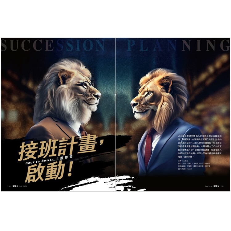 占台灣企業總市值45%的家族企業正面臨接班潮!根據調查,台灣家族企業掌門人超過65歲的比例高於全球,已進入世代交替階段,但多數企業的傳承規畫才剛啟動。本期專題全方位剖析家族企業傳承方針,從制定接班計畫、培養接班人到順利度過交接期,確保企業在交棒過程中穩定發展,邁向永續。