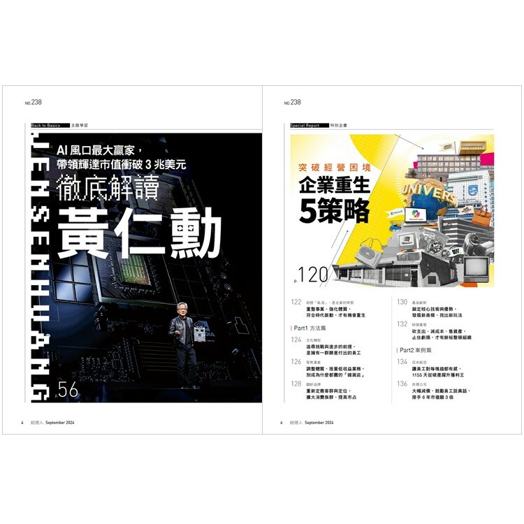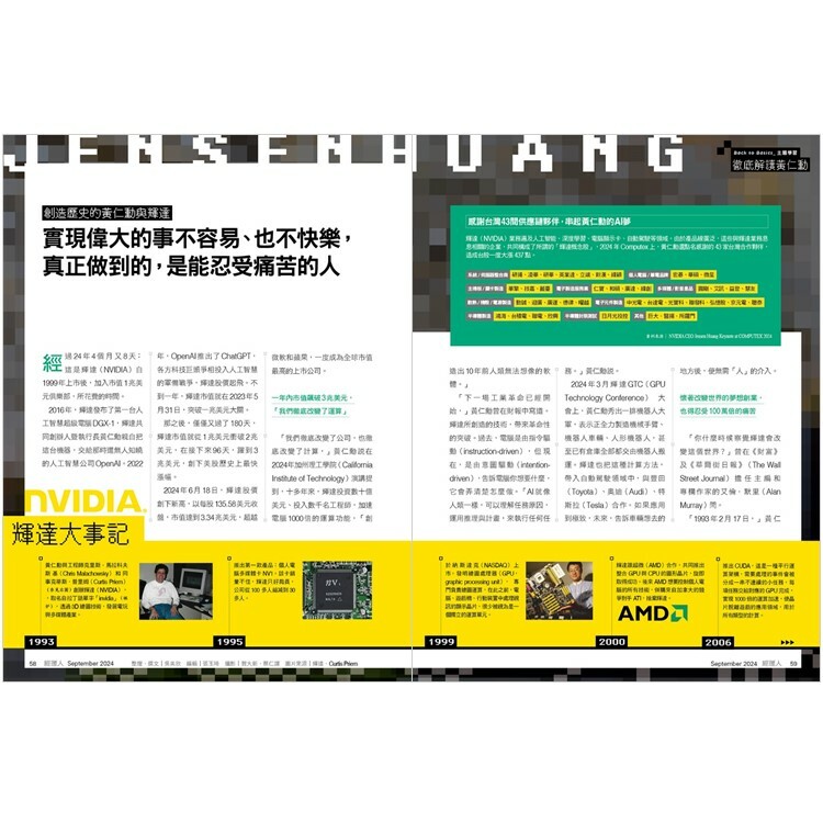 輝達(NVIDIA)共同創辦人暨執行長黃仁勳,是2024年最重要的商業人物,他帶領輝達發明GPU,從一度營運困難,到現在市值衝破3兆美元。因為他有遠見,也有實現不可能的韌性,屢敗屢戰的堅毅精神,創造出顛覆以往的技術,促成人工智慧的全面發生。本次專題整理黃仁勳16場精彩演說、逾10篇外國媒體採訪,帶你深入學習黃仁勳的經營管理與人生智慧