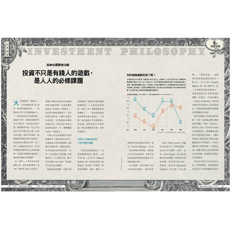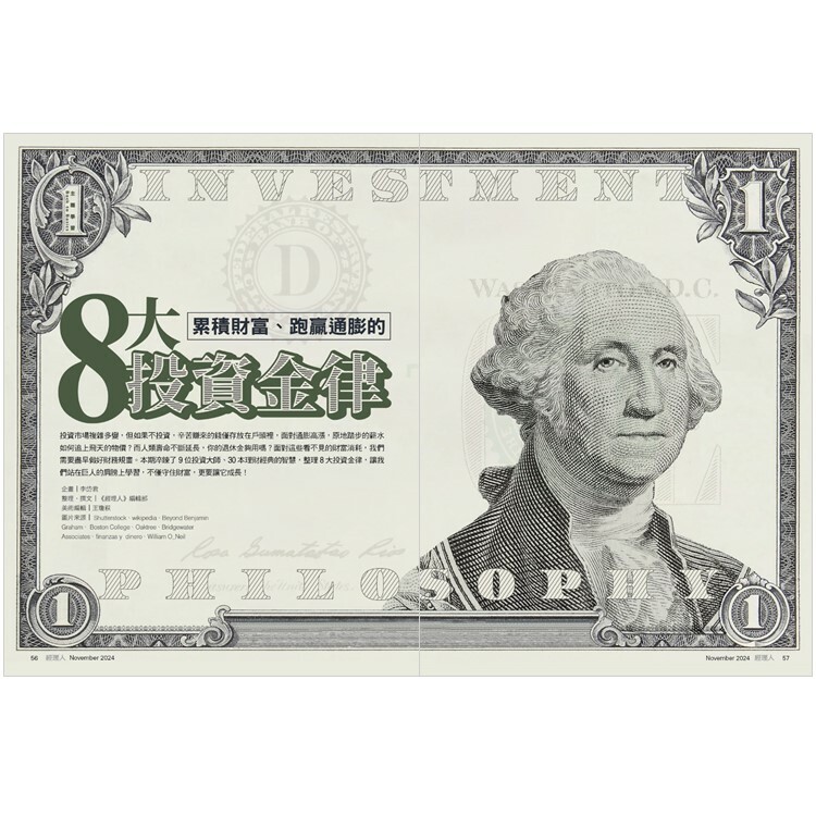 投資市場複雜多變,但如果不投資,辛苦賺來的錢僅存放在戶頭裡,面對通膨高漲,原地踏步的薪水如何追上飛天的物價?而人類壽命不斷延長,你的退休金夠用嗎?面對這些看不見的財富消耗,我們需要盡早做好財務規畫。本期淬鍊了9位投資大師、30本理財經典的智慧,整理8大投資金律,讓我們站在巨人的肩膀上學習,不僅守住財富,更要讓它成長!