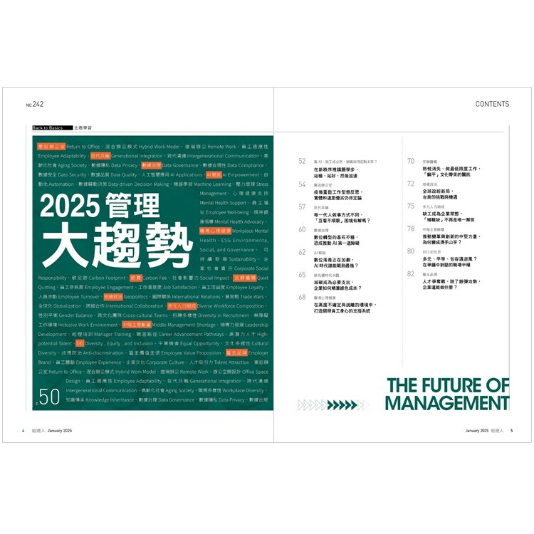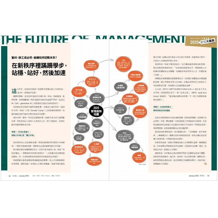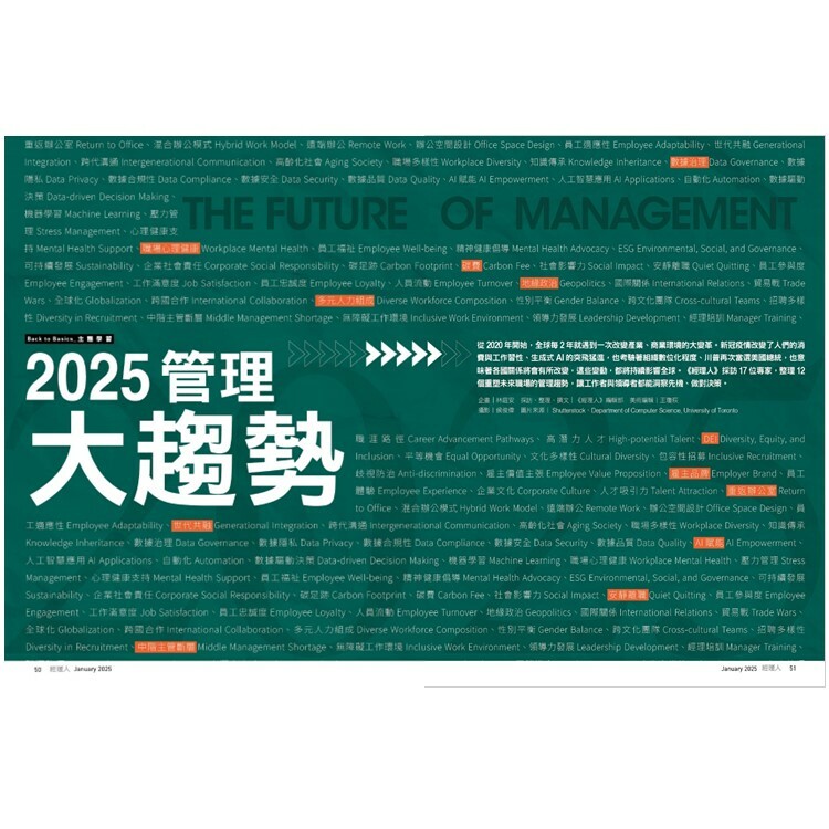 從2020年開始,全球每2年就遇到一次改變產業、商業環境的大變革。新冠疫情改變了人們的消費與工作習性、生成式AI的突飛猛進,也考驗著組織數位化程度、川普再次當選美國總統,也意味著各國關係將會有所改變,這些變動,都將持續影響全球。《經理人》採訪17位專家,整理12個重塑未來職場的管理趨勢,讓工作者與領導者都能洞察先機、做對決策。