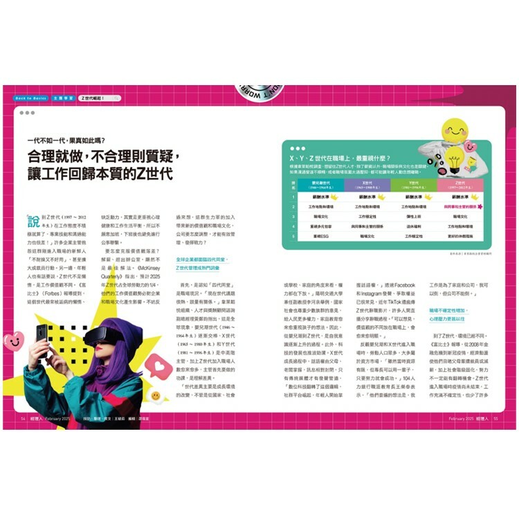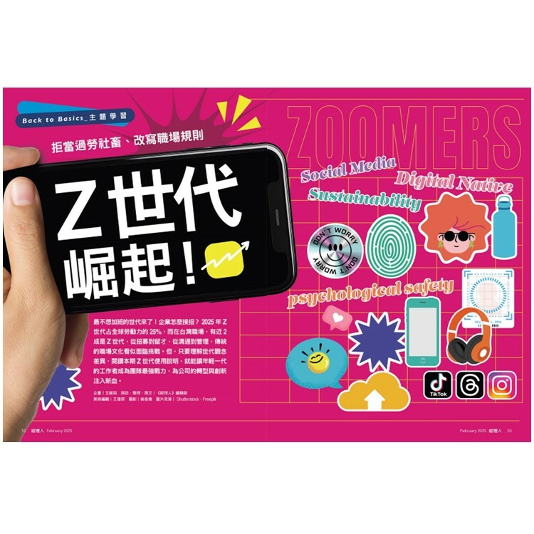 但,只要理解世代觀念差異,閱讀本期Z世代使用說明,就能讓年輕一代的工作者成為團隊最強戰力,為公司的轉型與創新注入新血。
