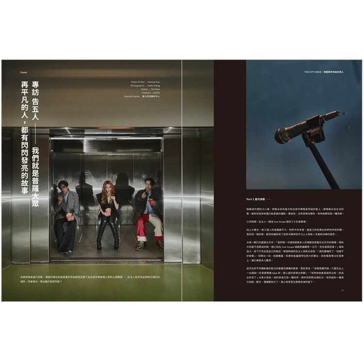 本期封面人物吿五人唱出屬於這個世代的歌,在城市裡種下了記憶,因而我們記住城市,城市也記住了我們,如果說他們的音樂是寫給城市的情歌,這座城市也就是眾人意念的集合體,城市除了地理上的定義,也是心理上的聚落,是虛擬中的現實也是現實中的虛擬,因不同價值主張而聚合,關於城市的多種文本,都是同時共同展開的。