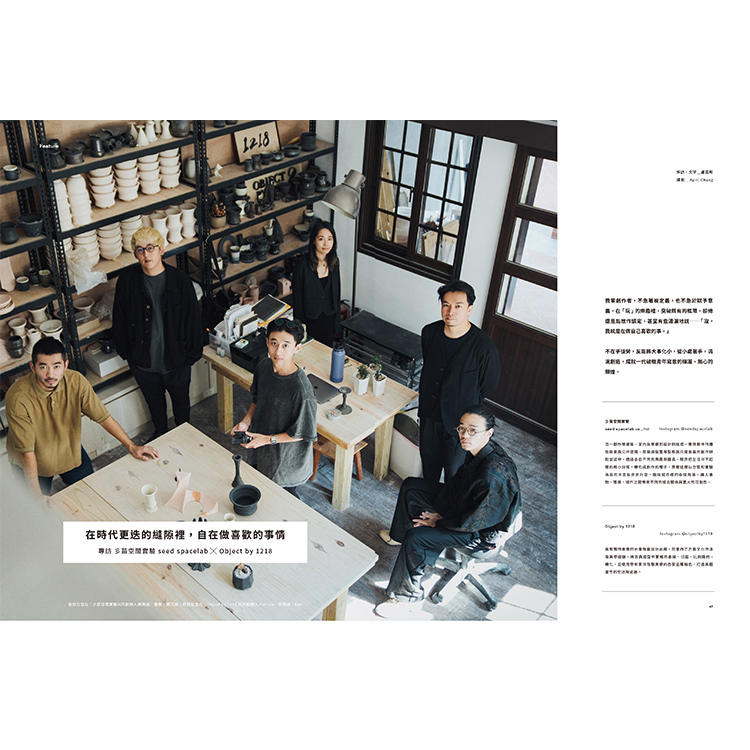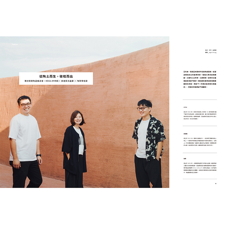 此次冬季號裡,我們試圖在持續性的破框創作中找到足以反映當代的視角,攝影師登曼波透過創作內觀與外探,在性別已成某種「政治正確」語境的當代,犀利地點出其中扭曲而未被著墨的邊疆地帶;非典型樂團毀容姐妹會在看似瘋癲與厭世的邊界,溫柔舔舐主流之外那些見不得光的破事,在訪問中淚眼婆娑地擁抱彼此,看見極限之外,依然存在友情的眷顧與支持;Object by 1218 與彡苗空間實驗展開跨世代的對話,看破框如何無心插柳,讓作品長出自己的模樣;本季封面設計師和平製品蔡賢臻,談破框並非必然,在努力不夠時髦的時代,如何用時間凝煉一種獨具的風格;而鶯歌陶二代安達窯・KOGA・陶聚以升斗小器拾起時代的重擔,復興是一條漫漫長路,有伴同行便不會孤單。
