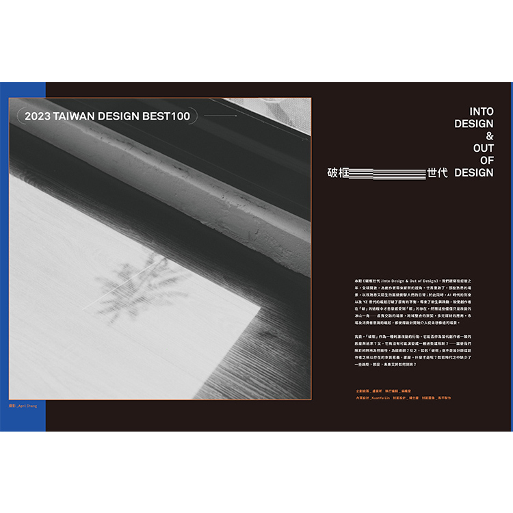 本期冬季號以「破框世代:Into Design & Out of Design」為題,意味著在深陷(Into)創作魅力之餘,力求突破(Out of)的勇氣。最後,在2023 年的尾聲,致所有不乖的創作者:我們之所以能在時代的框裡長出新生的嫩芽,在於創作的本質便是在極限之外野蠻生長。