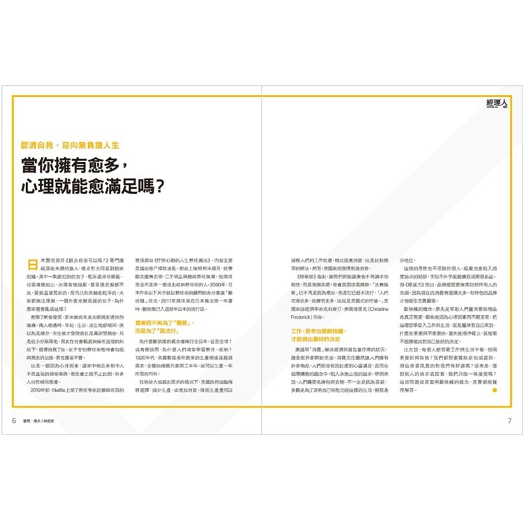 在人生中,你應該試著讓自己脫離成功的迷思,思考對自己來說,什麼才是最重要的;在經營管理上,與其改善10個弱點,不如徹底發展一個強項;在人際關係中,你可以學會拒絕別人的要求,正視自己的需求,不再為了滿足別人,而搞得自己筋疲力盡。 這期特刊從生活出發,告訴你在工作職場、人際關係、心靈成長、經營管理中,如何才能用「斷捨離」選擇最適合自己、最重要的事。