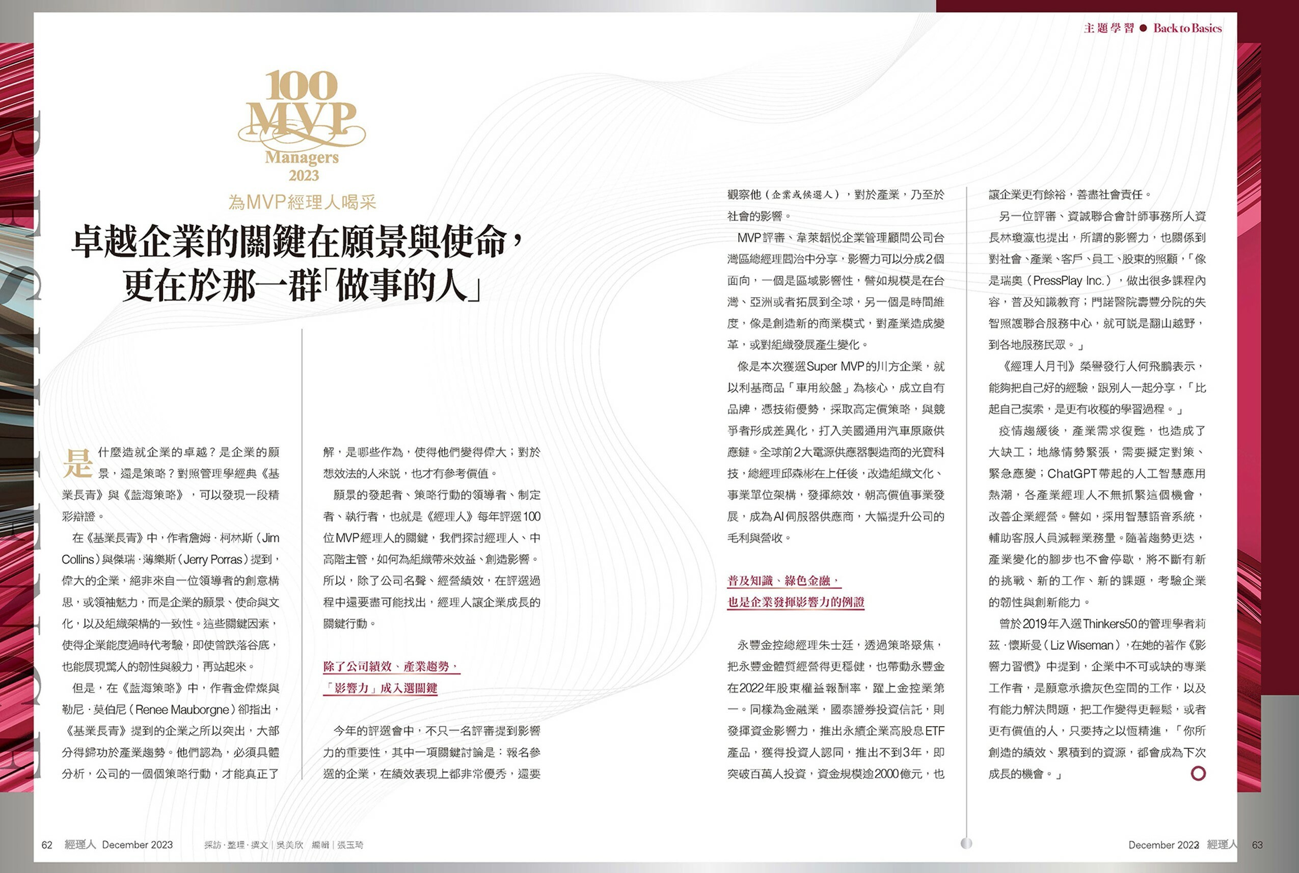 經理人》年度「100大MVP經理人」進入第16屆的2023年,主題定為「打造企業韌性」,選出超過100名(入選者包含團隊)跨產業的傑出經理人和工作者,肯定他們為所屬的組織和團隊,創造了績效和價值。 韌性(resilience)一詞,用在商業的語境裡,通常是指周遭環境面臨變動、陷入危機之際,組織具有抵禦的能力,還可以快速復原。